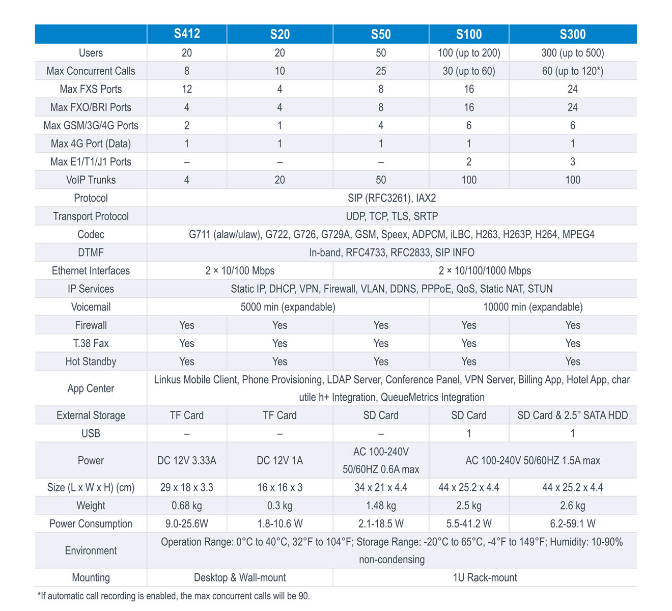 Yeastar S300, 300 Dahili telefonu destekler. 500 dahili aboneye kadar genişletilebilir. Kurumsal sınıf IP telefon çözümleri sunar. S300, 24 adede kadar analog bağlantı noktasını, 24 adede kadar BRI bağlantı noktasını ve 3 E1 / T1 / PRI port destekler. Bunun yanı sıra 6 GSM kanalı takılabilir. Yeastar’ın en yeni S Serisi IP PBX hattının bir parçası olan Yeastar S300’ün kurulumu kolaydır, yönetimi kolaydır ve eksiksiz bir ofis telefon sistemi olarak geliştirilmiştir.